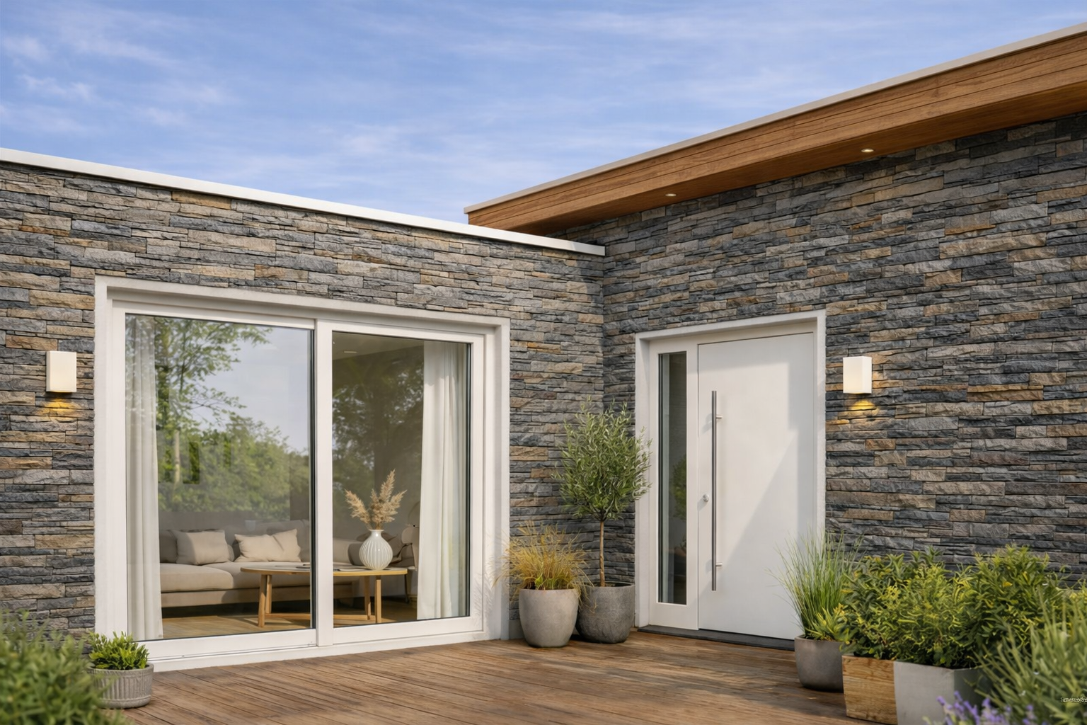Przykład elewacji z kamienia, dodatków drewnianych + okna i drzwi w kolorze Cloud Dancer